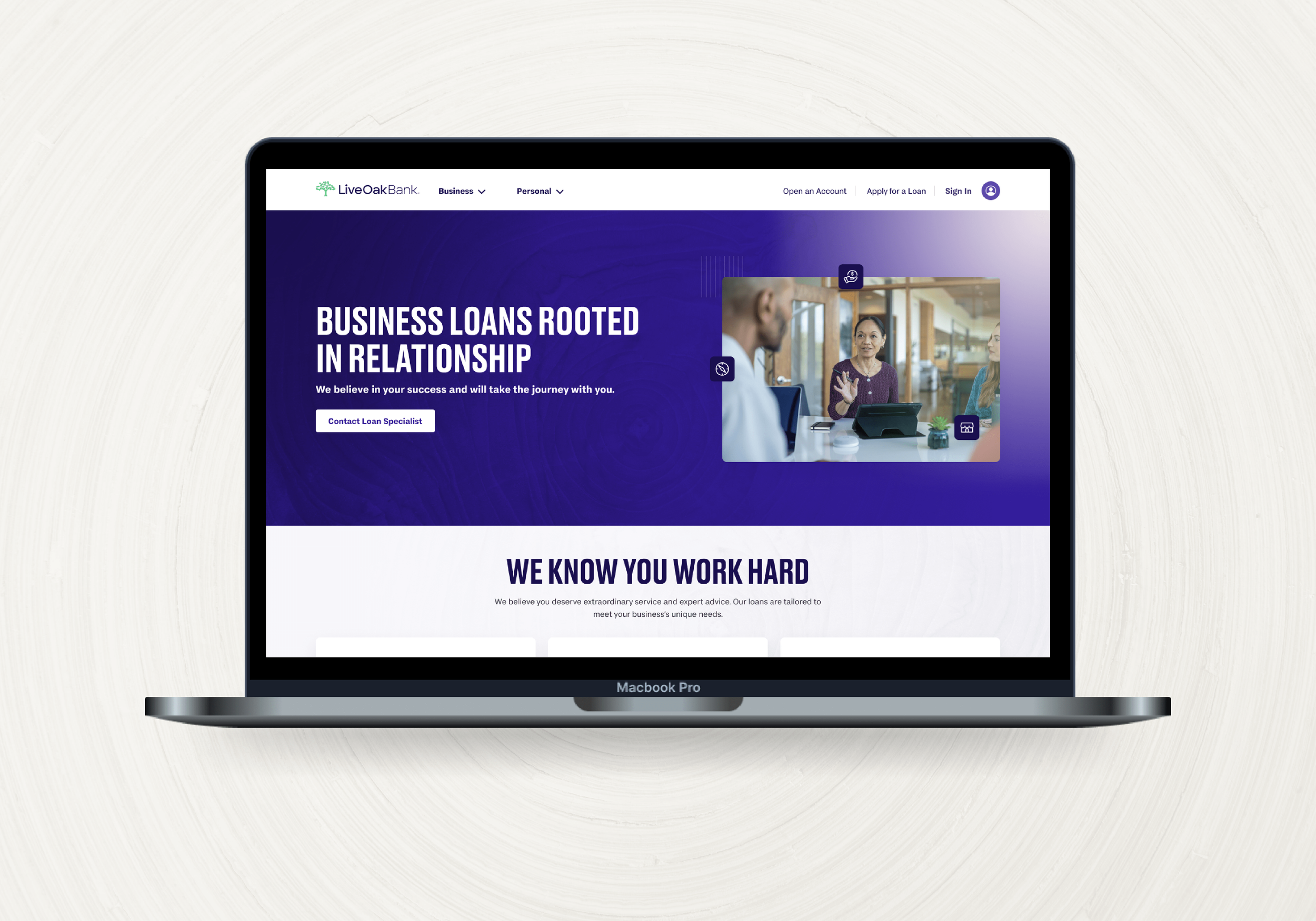 For a digital bank, our website is our front door. Needing some renovation, I led the design of a new website for Live Oak Bank to highlight a customer-centric approach while maintaining an easy-to-use navigation and site structure that highlights Live Oak's approach to technology. An effort across the creative and CX teams, I helped lead countless hours of stakeholder and customer interviews, as well as information architecture planning, UI/UX, copy, and design working sessions to nail the refresh of the website. We topped off the redesign with a 4-day photoshoot with about 15 crew members and over 40 models to customize the photography on the website instead of using stock photography.